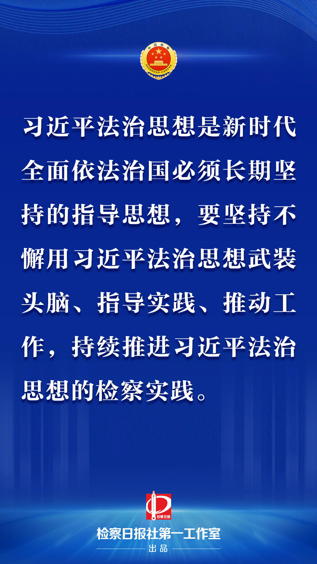 要深刻认识习近平法治思想是新时代全面依法治国必须长期坚持的指导思想,坚持不懈用习近平法治思想武装头脑、指导实践、推动工作,切实抓好习近平法治思想的学习宣传、教育培训、研究阐释,持续推进习近平法治思想的检察实践。